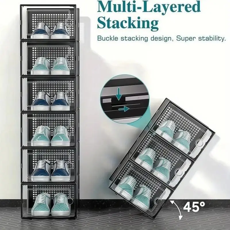 The stackable design of this shoe box organizer saves space and makes it easy to store multiple pairs of shoes.